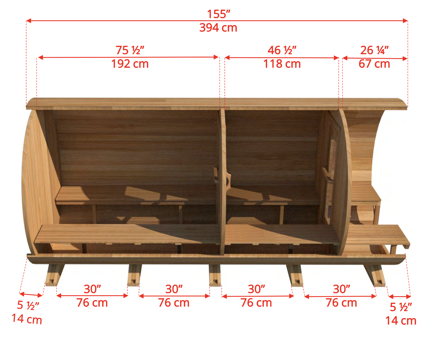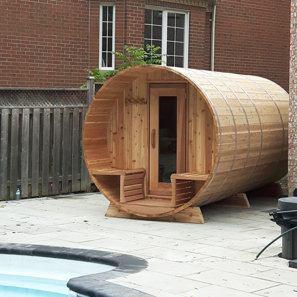 Barrel Sauna 7’x7′ with Change room & Porch – Knotty Cedar